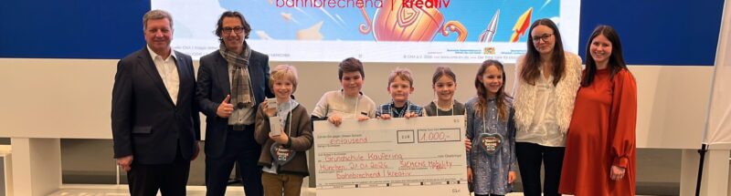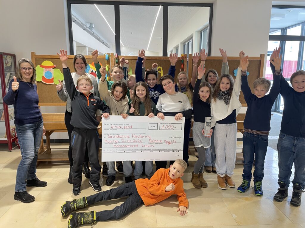 There is great excitement at the school following Class 4c’s win of the main prize in the ‘Creative’ category of the ‘bahnbrechend2025’ student competition. The students impressed the jury with their innovative ideas for sustainable mobility, which they had developed during a school project. They were rewarded with a €1,000 prize for their class fund, as well as a trophy. The award was presented at a ceremony hosted by Knorr-Bremse in Munich by Christian Bernreiter, State Minister, and Dean Balatinac, from Siemens Mobility.