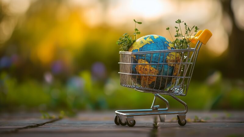 Mini shopping cart with globe and plants symbolizes sustainable consumer choices.